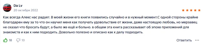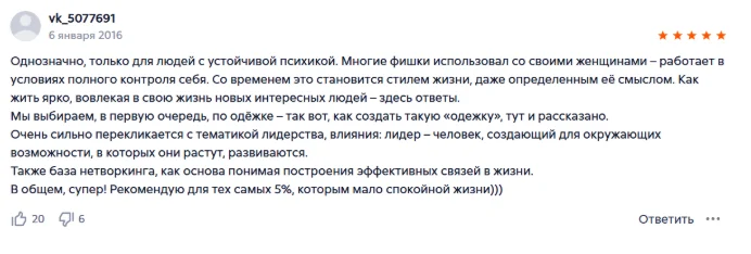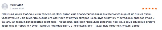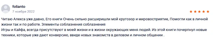 Отличная книга, общение с девушками вышло на новый уровень. уже получаю огромное удовольствие и внимание от женщин, ухаживаний и подчинение происходит автоматом, уже через месяц изучения системы соблазнил девушку за пару часов , огромная благодарность Алексу да его знания.